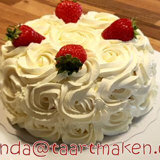 - Snij de taart in 3 lagen. Snijd de aardbeien in stukjes maar hou een paar mooie aardbeien achter om te sieren. Leg op elke laag biscuit een paar lepels aardbeiengelei en smeer het met een spatel mooi uit. Neem de aardbeienstukjes er bij en leg ze op de gelei. Leg hier nu een laag slagroom op en smeer mooi gelijkmatig uit met de spatel. Leg de volgende laag biscuit er op en herhaal gelei, aardbeien en slagroom. Leg het deksel op de taart en smeer er een beetje slagroom op. Vul de zijkanten van de taart ook op. Neem een spuitzak met een rozet spuitmondje en vul de zak met de rest van de slagroom. Begin met het opspuiten van de rozetten. Eerst de bovenkant en dan de zijkanten. Leg er een paar aardbeien op als versiering.